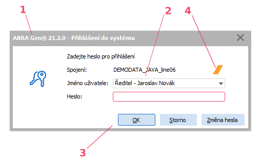 Přihlašovací dialog se nabízí jednak v průběhu spuštění systému a jednak při otevření agendy volbou Otevřít v novém okně jako jiný uživatel. Z toho plyne, že pokud se chce k systému spuštěnému z jednoho PC přihlásit jiný uživatel, jsou dvě možnosti