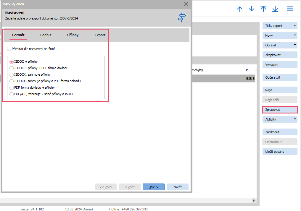 Formát - Nejdůležitější záložka, kde zvolíme, zda budeme chtít vyexportovat ISDOC formát s přílohou XML, nebo zda má být součástí také PDF příloha s dokladem.