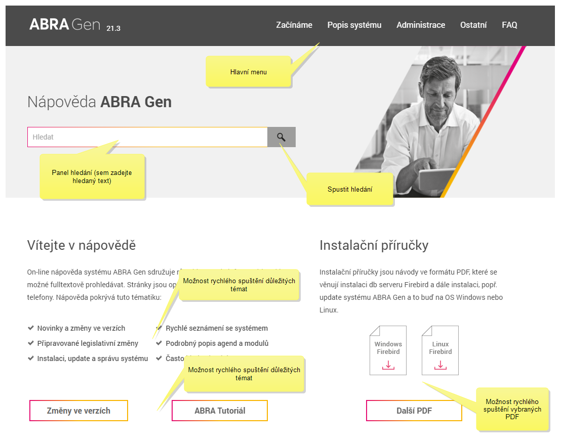V menu Začínáme naleznete témata vhodná na začátek práce se systémem týkající se práce s nápovědou a dále vhodná pro první seznámení se s produktem, vč. příručky QuickStart a návodné výukové příručky ABRA Tutoriál, popis změn ve verzích apod.