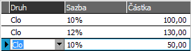 V tomto případě se mezi řádky se zbožím v sazbě 10% v poměru jejich celkových cen bude rozdělovat celková zadaná částka za clo pro sazbu 10%, tj. 150Kč (100Kč+50kč).