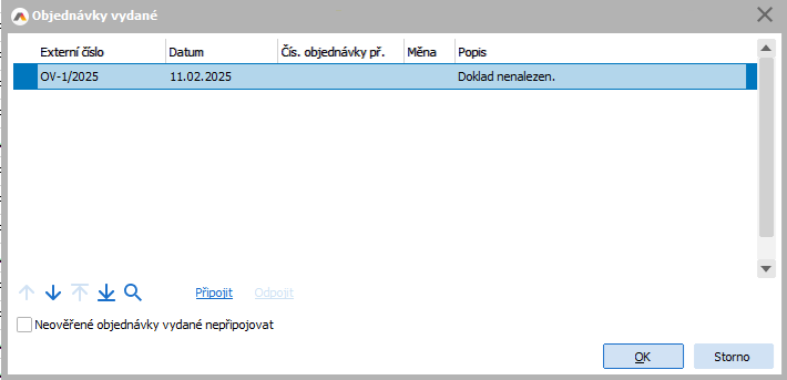 Vazbu na OV bude možné provést pouze pro ty OV, kde je uvedeno v položce Popis "V pořádku". Pokud objednávku nepřipojíte nebo je u připojeného dokladu nějaký problém (např. je na něm jiná firma), nebude možné pokračovat. V takovém případě je možno zatrhnout "Neověřené objednávky vydané nepřipojovat" a pokračovat bez vazby na ně nebo import ukončit (tj. zpracování dokumentu se přeruší, žádné doklady (ani faktura ani příjemka) nebudou vystaveny, stav zpracování dokumentu se nezmění).