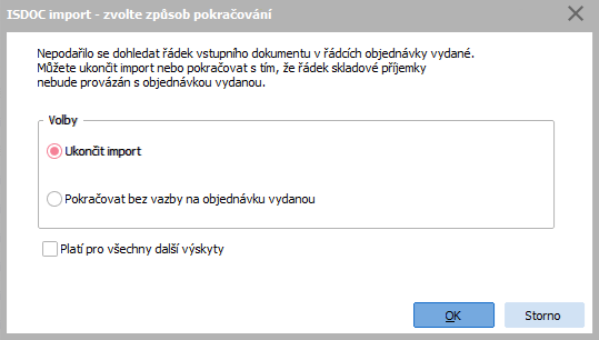 Pokud objednávka v importu obsahuje i neskladové řádky, porovnává se obsah tagu <Item.Description> s textem na řádku dohledané objednávky přijaté. Pokud vybraná objednávka (ať dohledaná systémem automaticky nebo připojená ručně) nebude obsahovat řádek s importovanou skladovou kartou, viz výše, nebo u neskladových řádků s odpovídajícím textem v řádku, je možno pokračovat bez vazby na objednávku nebo import ukončit (zpracování dokumentu se přeruší, žádné doklady (ani faktura ani příjemka) nebudou vystaveny, stav zpracování dokumentu se nezmění).