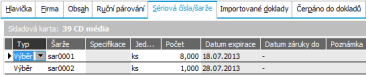 Oba typy lze pro jeden skladový řádek kombinovat, pokud zadáváte k jednomu řádku více šarží/s.čísel. U některých dokladů (např. vratky) není výběr typu k dispozici, a šarže/sér.čísla lze zadat jedině importem ze svázaného dokladu. |