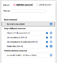 - Ostatní uložená omezení - obsahuje seznam ostatních uložených omezení, která jsou viditelná a dostupná aktuálně přihlášenému uživateli. Uživatel vždy vidí pouze omezení, která jsou jeho vlastní (tj. definice Jen pro vás), dále která sdílí s jinými uživateli (tj. definice Sdílené, u nichž je v seznamu uživatelů sdílejících toto omezení) a nebo která jsou společná pro všechny uživatele (tj. definice Globální). Viz též popis funkce Sdílení.