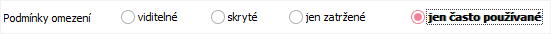 Seznam definic je možné filtrovat toho, které definice jsou nastavené jako skryté. Tj. je možné definice, které se nepoužívají, ale není vhodné je smazat, skrýt. V zobrazení definic je pak možné přepínat mezi všemi definicemi a definicemi pouze viditelnými (tj. těmi, které nemají příznak skryté).