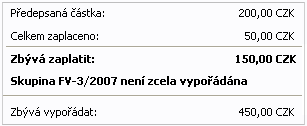 | Celkem zaplaceno | Suma všech dosud provedených plateb aktuálního placeného dokladu. |