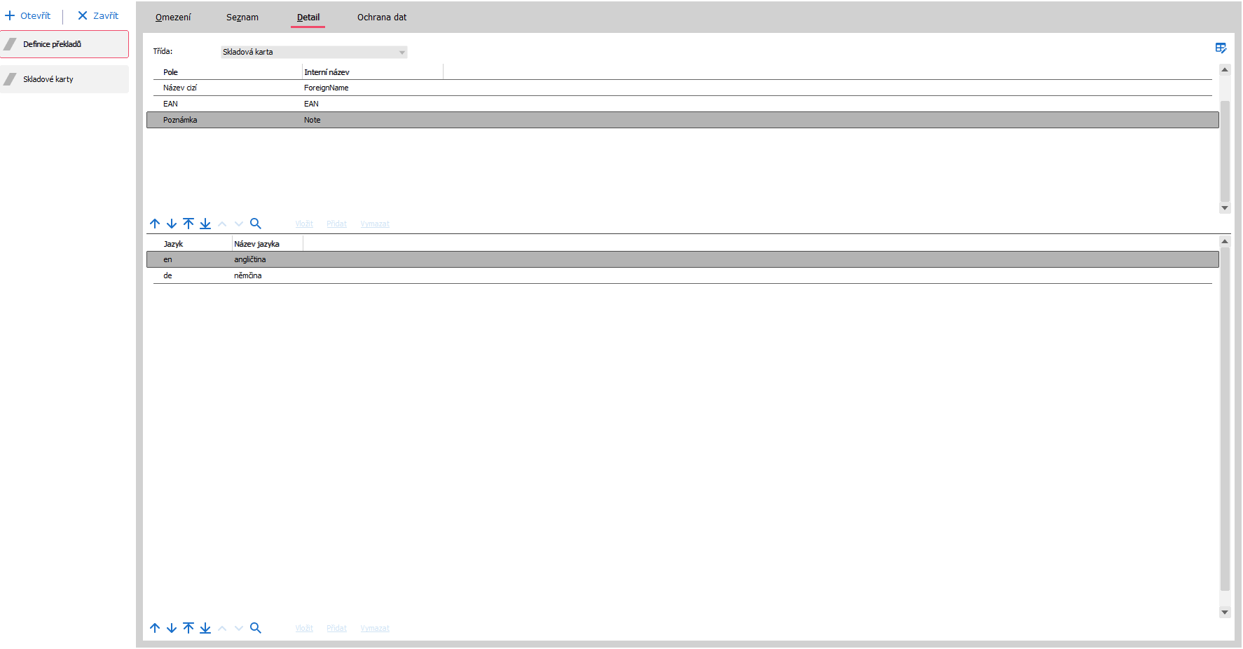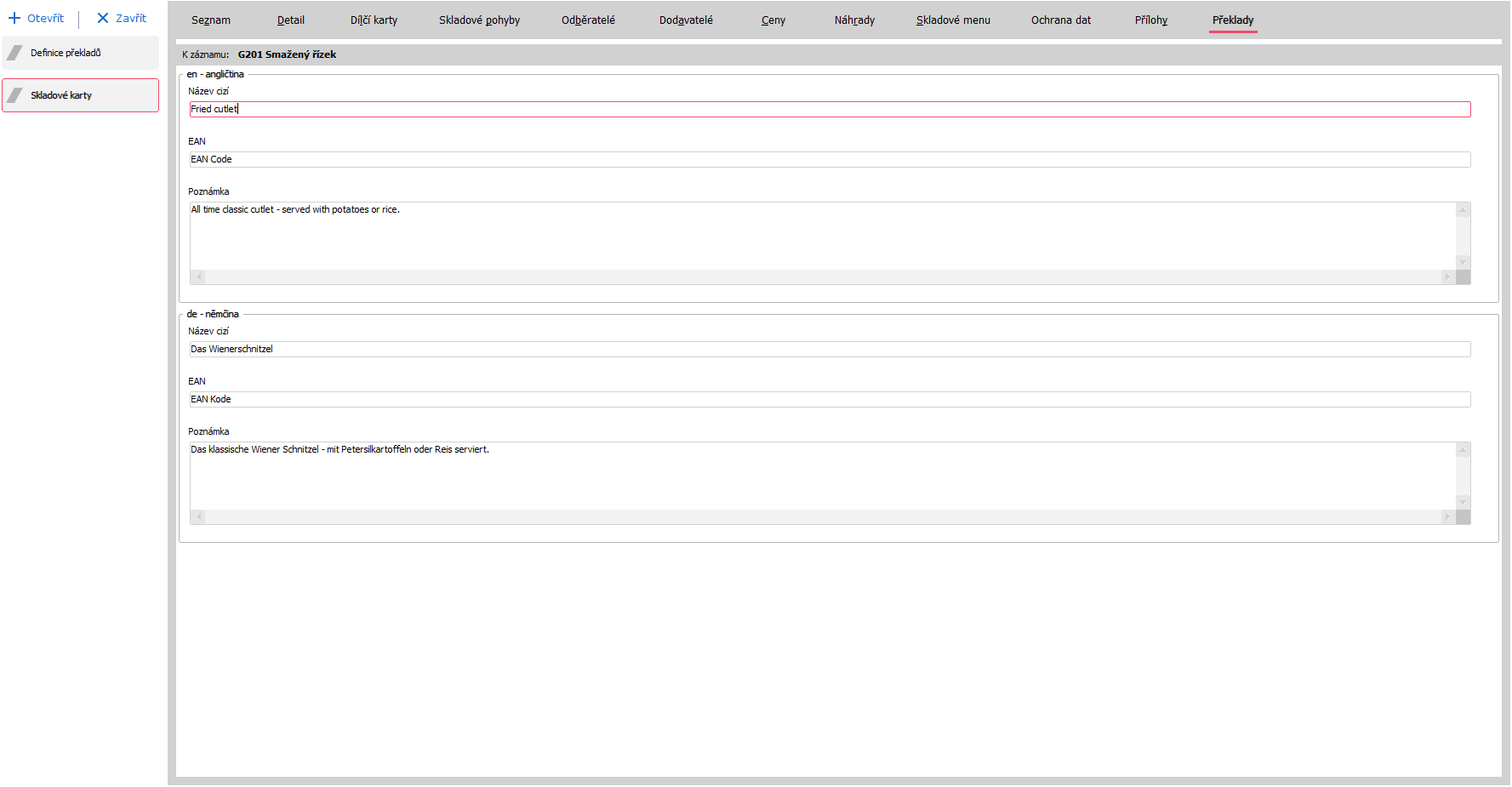 Vlevo: Příklad záložky Překlady, zde v Agendě Skladové karty, kterému předcházelo zadání překladů do 2 jazyků u 3 objektů v rámci Agendy Definice překladů.
