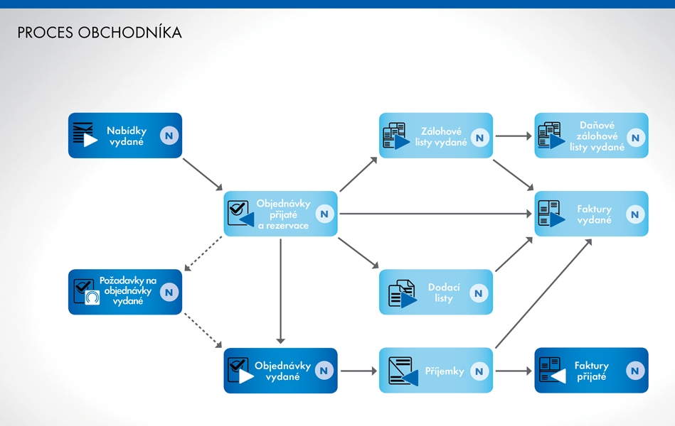 Příkladem může být schéma demonstrující jeden z možných základních procesů obchodníka na prodej resp. nákup zboží. Jiným příkladem může být schéma demonstrující jeden z možných nejzákladnějších procesů zpracování faktury vydané. Tj. vystavení zálohových listů a jejich zaplacení, následné vystavení faktury s importem těchto záloh a případně úhrada doplatku, následné vystavení inverzních dokladů příp. jiných dokladů potřebných pro daný typ obchodu. V realitě to samozřejmě může být mnohem složitější, do hry mohou vstoupit např. poptávkový proces, schvalování dokladů, požadavky na výrobu prodávaných položek apod.