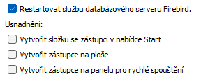 Volba Restart služby databázového serveru je ve výchozím stavu zatržena. Pro správnou funkci databázového serveru ji v zatrženém stavu ponechte. Možnost odtržení je zde jen pro případy, kdy je potřeba restartovat databázový server manuálně. Restart je nutný z důvodu aktivace instalovaných ICU knihoven a provede po skončení instalace před Update databáze