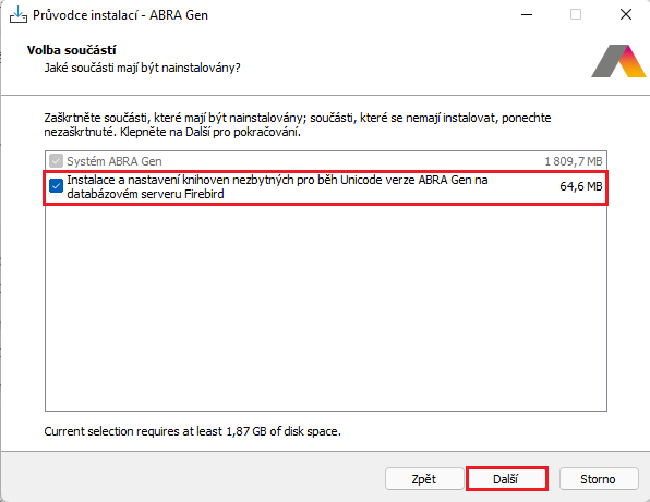 Zde je napevno nastavena volba instalace ABRA Gen. Volitelně můžete vybrat, zda se budou instalovat také knihovny nezbytné pro správné fungování Unicode verze. Tato volba je ve výchozím stavu zatržena. Doporučujeme ji ponechat zatrženou, aby se soubory nakopírovaly do adresáře ve složce Firebird, čímž se zajistí správná funkčnost aplikace ABRA Gen. Pokud byste se rozhodli knihovny neinstalovat, bude třeba následně knihovny nakopírovat ručně. Další informace o tomto tématu v kapitole zde.