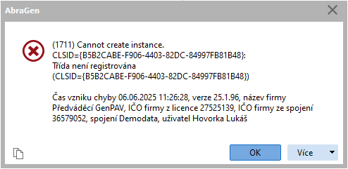V určitých případech, např při načítání Tiskových sestav do instalační sady se může zobrazit místo chyby s konkrétním CLSID pouze text Interface not supported.