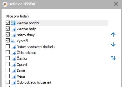 Příklad nabídky položek (klíčů), podle nichž je možné výsledný seznam v daném místě programu seřadit. Zatržením a úpravou pořadí lze nastavit kombinaci, podle níž se bude aktuálně třídit.
