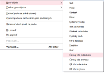 Funkce pro vložení nového prvku do definice do příslušného místa tisk. sestavy. Jednotlivé možnosti je možno vybrat z nabídky lokálního menu dostupné pod volbou Nový objekt. K dispozici jsou k výběru vždy jen ty prvky, které je možno v daném okamžiku vložit s ohledem na to, v jakém místě definice tisk. sestavy se nacházíte, a s ohledem na již nadefinované prvky (některé kombinace nejsou povoleny). Význam jednotlivých voleb viz Seznam prvků, vkládání a vlastnosti prvků. Příklad vyvolání funkce vložení objektu a vložení komponenty pro tisk čárového kódu Většina nabízených voleb je paralelně dostupná přes ikony k funkcím editoru tiskových sestav vertikálního panelu popsané výše. |