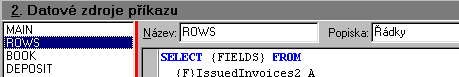 SQL "Faktury vydané" má několik datasetů (hlavička, řádky, účetní deník, zálohy, šarže,...), zobrazená syntaxe SQLdotazu patří k aktuálnímu datasetu Rows