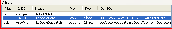 Příklad aliasu na objekt TNxStoreCard v datasetu MAIN v SQL příkazu Skladové šarže