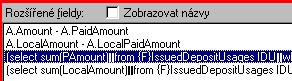 Mějme SQL dotaz z předchozího příkladu a rozšířenou položku s aliasem "DepositAmount" a popiskou "Zaplaceno na zálohách". Pak v seznamu nabízených datových položek objektu bude k dispozici mj. položka "DepositAmount" s popisem "Zaplaceno na zálohách".
