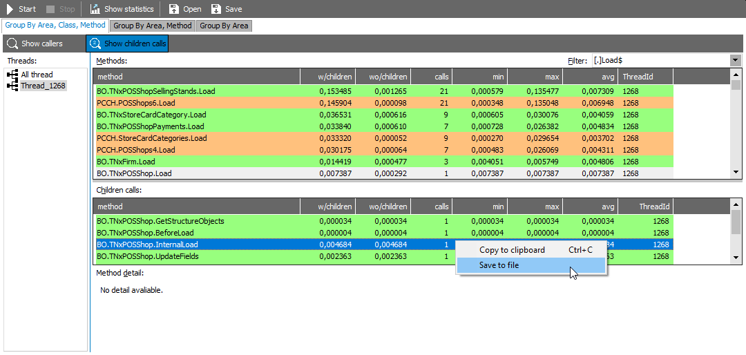 | Show children calls | Zobrazí okno vnořených volání, které volá aktuální řádek. Při pokliku na řádek vnořeného volání se kurzor označí toto vnořené volání v hlavním seznamu. |