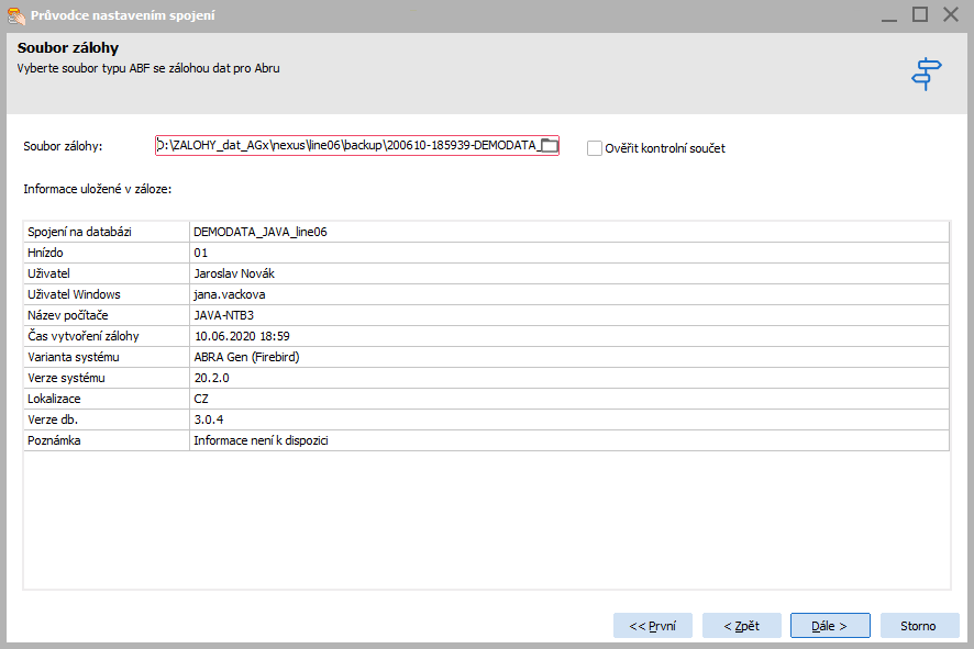 Zde zadáte zálohu dat, z níž chcete data do vybraného spojení obnovit. Pro popis tohoto kroku platí totéž jako pro krok Soubor zálohy u akce Přidat nové spojení.
