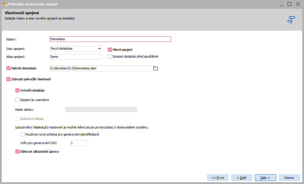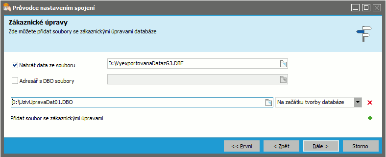 | Editovat zákaznické úpravy | Je k dispozici pouze, je-li v položce Stav spojení hodnota Nová databáze. Je-li zatrženo, zpřístupní se další krok průvodce Zákaznické úpravy. Jaké jsou účely těchto úprav, viz popis příslušného kroku. | |