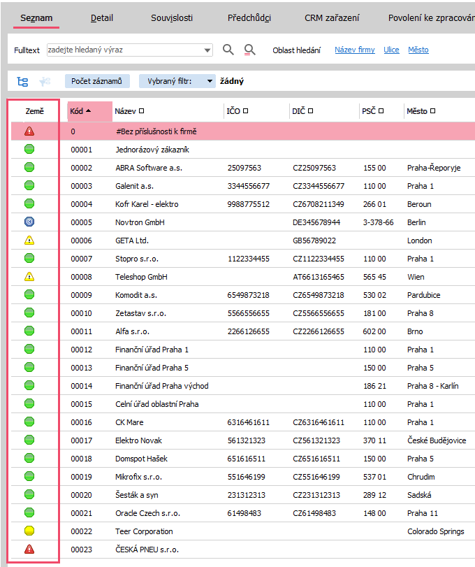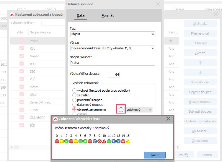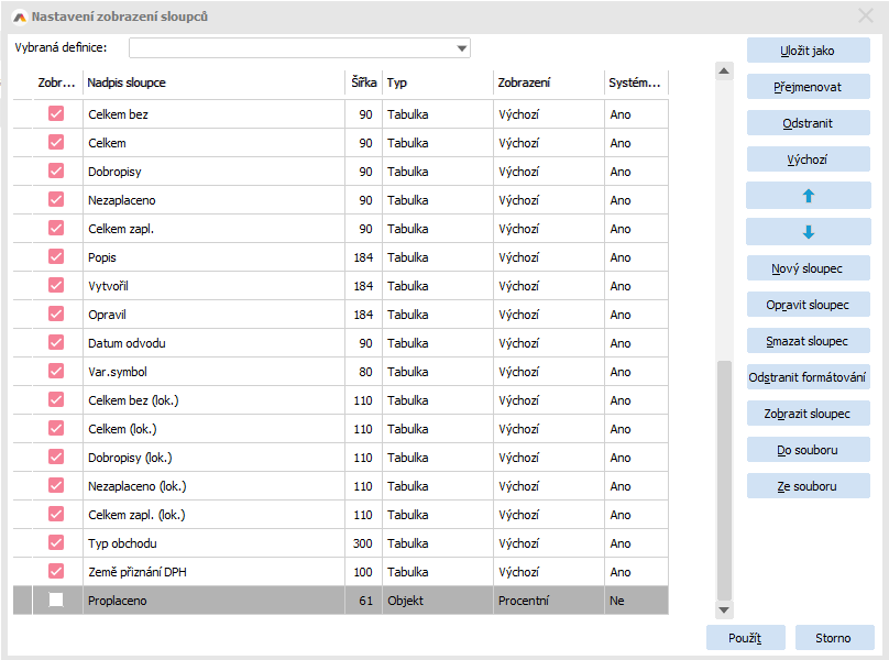 Slouží k nadefinování obsahu a vzhledu seznamů zobrazovaných v různých záložkách jednotlivých agend (tj. definice zobrazení sloupců, jejich pořadí atd.). Jedná se o jednu z možností, jak měnit pořadí a šířku sloupců, skrývat sloupce v seznamu. Pomocí editoru sloupců si můžete přidávat i vlastní definovatelné sloupce.