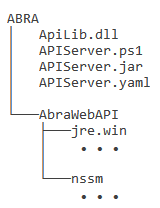 Kromě samotné aplikace Web API serveru (APIServer.jar) je ke spuštění Web API (případně instalaci a provozu Windows služby) zapotřebí ještě obsah složky AbraWebAPI (která je rovněž součástí instalace ABRA Gen). Dávkový soubor APIServer.ps1 používaný ke spouštění/instalaci/odinstalaci API serveru předpokládá, že tato složka bude v rámci adresářové struktury bezprostředně podřízená složce, ve které se nachází APIServer.jar (a APIServer.ps1). Složka AbraWebAPI obsahuje dvě podsložky: