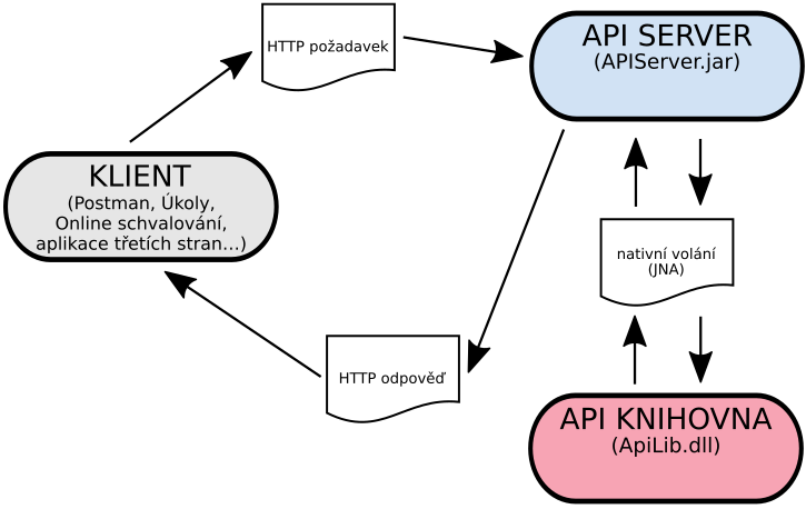Klient pošle HTTP požadavek, server požadavek obdrží a předá ho API knihovně (prostřednictvím nativního volání metody handleRequest, která je v knihovně implementována). Knihovna zařídí vyhodnocení požadavku v souladu s business logikou systému ABRA Gen a vrátí odpověď serveru, který ji následně přetlumočí klientovi.