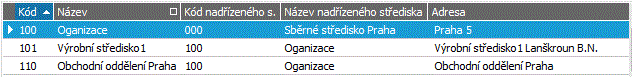 Příklad záložky Seznam číselníku středisek