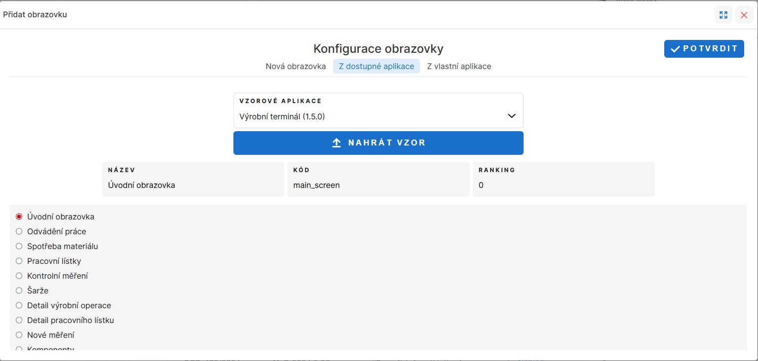 Z dostupné aplikace – zde je třeba vybrat aplikaci v selecboxu Vzorové aplikace a potvrdit tlačítkem Nahrát vzor. Následně se zobrazí všechny dostupné obrazovky vybrané aplikace. Lze vybrat vždy jednu aplikaci. Po vybrání obrazovky je možné upravit Název, Kód i Ranking. Po kliknutí na tlačítko Potvrdit se obrazovka vytvoří.