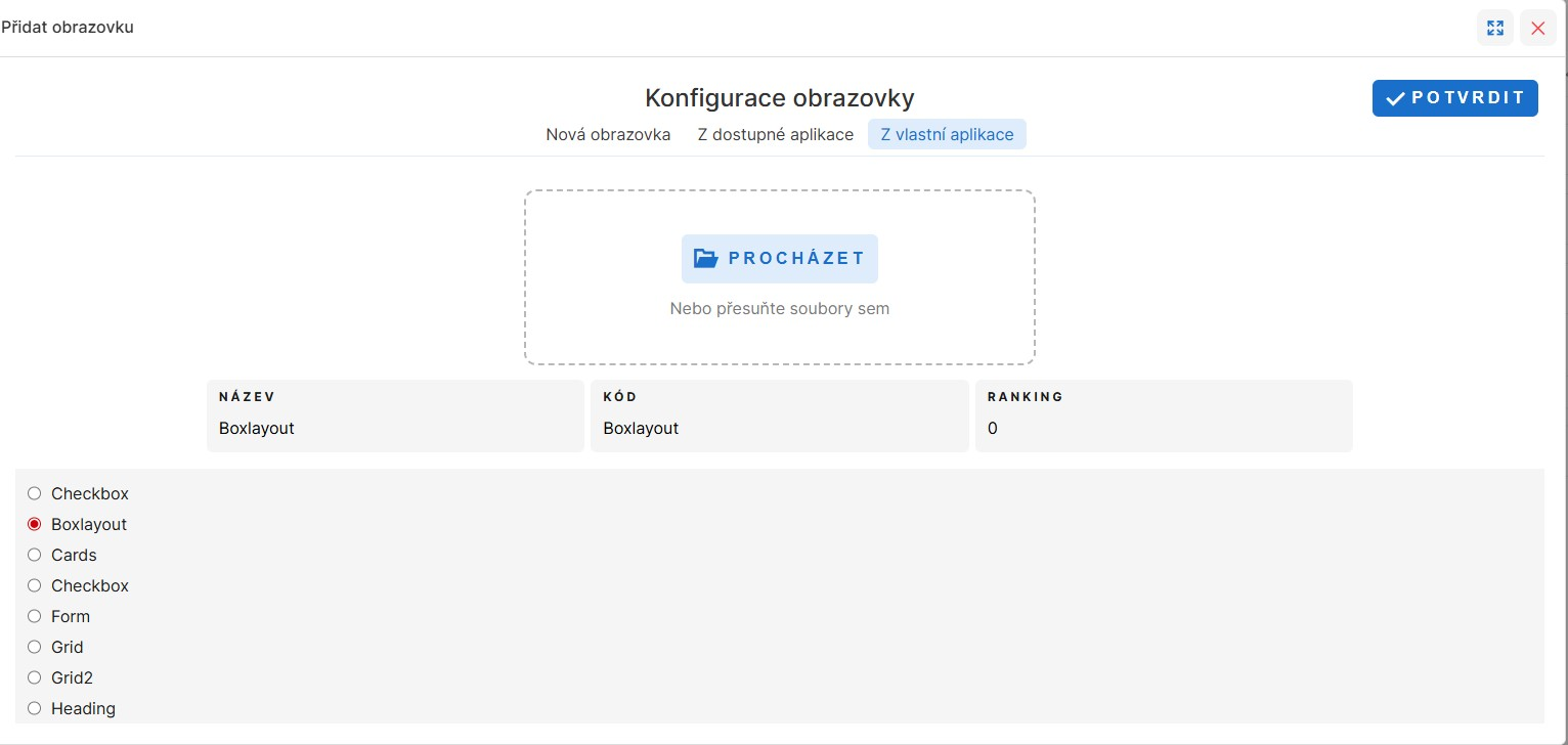 Z vlastní aplikace – zde je možnost nahrát svoji aplikaci stejně jako při importu aplikace. Poté se zobrazí seznam obrazovek, které je možné nahrát, lze jednu vybrat, případně upravit Název, Kód a Ranking a tlačítkem Potvrdit se obrazovka do aplikace nahraje.