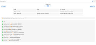 V dalším kroku jsou k dispozici informace o importované aplikaci - o její verzi, názvu, kódu a podobně. Pokud již aplikace existuje, je na to uživatel upozorněn. Importovat lze všechny nebo jen libovolné obrazovky aplikace. Ve výchozím stavu jsou k importu vybrány všechny obrazovky aplikace. V případě, že aplikace již existuje, je u jednotlivých obrazovek upozornění formou oranžového výstražného trojúhelníku, že tato obrazovka bude přepsána. V případě, že byste importem provedli přepsání obrazovky se zákaznickými úpravami, zobrazí se výstražný trojúhelník v červené barvě. V takovém případě je potřeba jednotlivé červené obrazovky vyřešit manuálním zásahem konzultanta.