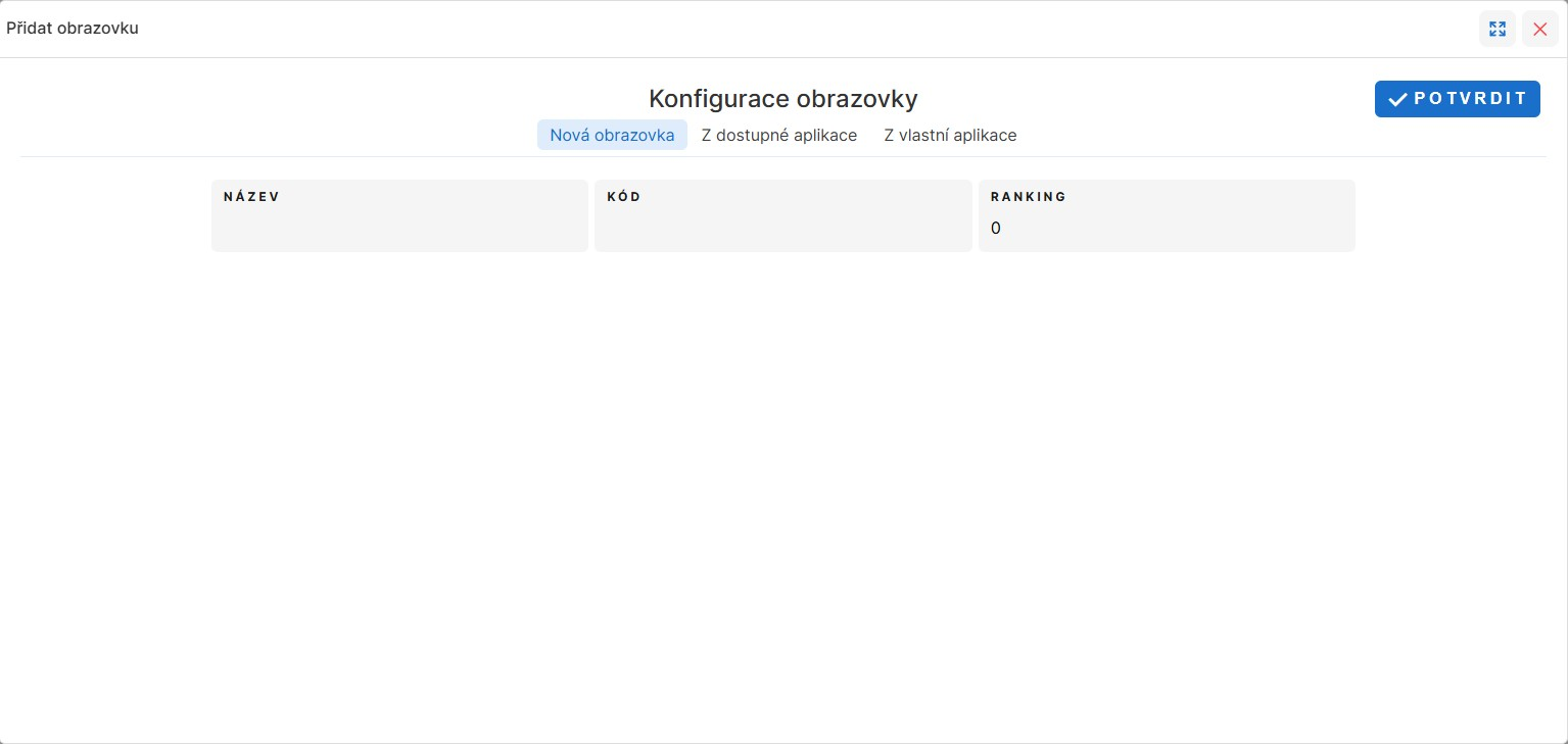 Nová obrazovka– zde je třeba vyplnit Název a Kód obrazovky, případně Ranking, což je umístění v levém menu (čím vyšší číslo, tím výše bude obrazovka umístěna). Po kliknutí na tlačítko Potvrdit se obrazovka vytvoří.