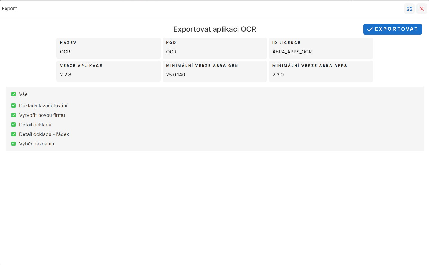 V následující obrazovce je možné vybrat obrazovky, které chcete z aplikace exportovat. Ve výchozím stavu jsou vybrány všechny obrazovky. Kromě obrazovek jsou zde vidět informace o verzi aplikace, jejím názvu, kódu atd. Tlačítkem Vyexportovat dojde k exportu aplikace a uložení souboru s názvem aplikace. Soubor je ve formátu JSON. Export je bez uživatelských parametrů (v budoucnu bude možné zvolit, zda se mají také exportovat).