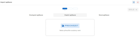 Druhá záložka s názvem Vlastní aplikace umožňuje nahrát aplikaci z JSON souboru. K nahrání souboru lze použít tlačítko Procházet nebo je možné soubor přetáhnout do označeného pole.