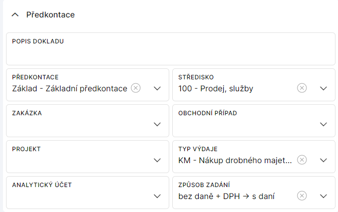 Středisko, Zakázka, Obchodní případ, Projekt, Typ výdaje - Tyto položky jsou součástí sekce Předkontace. Jsou viditelné jen v případě, že máte nastaveno v agendě Firemní údaje jejich použití.