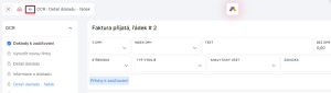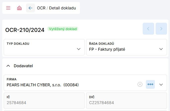 U prvního vytěženého dokladu je potřeba položky vyplnit ručně, jednotlivá pole budou prázdná. U dalších dokladů na stejnou firmu se údaje předvyplní z předchozího dokladu, a to konkrétně z prvního řádku. Hodnoty se doplní do všech řádků dokladu za předpokladu, že původní hodnota na řádku, odpovídá hodnotě zobrazené v této části.