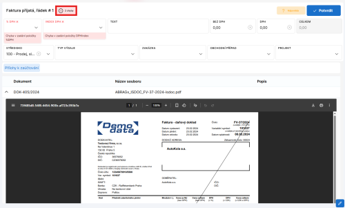 V průběhu editace řádků je stále zobrazen náhled vytěženého dokladu, případně příloh. Zobrazen může být vždy jen jeden doklad současně. Nad seznamem jednotlivých položek je vidět počet chyb, viz obrázek.
