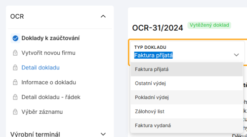 Kromě Faktur přijatých lze těžit i další doklady. Konkrétně tyto: Ostatní výdaje, Pokladní výdej, Zálohový list vydaný, Faktura vydaná. Dle typu dokladu se následně mohou lišit zobrazená pole k doplnění údajů - typicky FV bude mít trochu jiné pole než Zálohový list v. Systém se sám snaží poznat, zda se jedná o zálohový list přijatý. Určení typu se dále řídí podle posledního dokladu na stejnou firmu (faktura přijatá, ostatní výdaj , pokladní výdej)