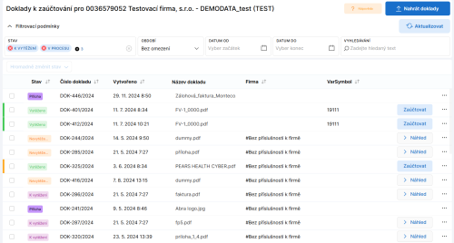 Pro snadné rozlišení kvality vytěžení jsou jednotlivé doklady označeny vlevo barvami, viz obrázek níže. Význam jednotlivých barev popíšeme dále v textu.