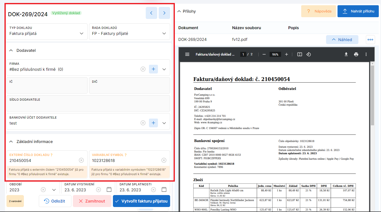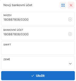 Bankovní účet dodavatele - podobně jako firma se předvyplní na základě vytěžených údajů v případě, že již v systému existuje. Pokud je bankovní účet vytěžen, ale nebyl v systému dohledán, je předvyplněn, jako nový bankovní účet s nutností uložení nového záznamu. Případně po stisku tlačítka