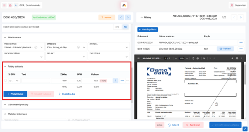 V řádcích dokladu jsou vyplněny vytěžené hodnoty. V základním náhledu jsou viditelná pole % DPH, a Text. Další položky řádků jsou zobrazeny po stisku symbolu tří teček