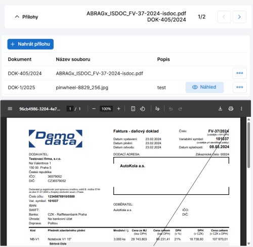 Tlačítko Nahrát přílohu - plní stejnou funkci jako vytvoření dokumentu pomocí nahrání přílohy, popis např. zde. Příloha se stane součástí (přílohou) zaúčtovaného dokladu.