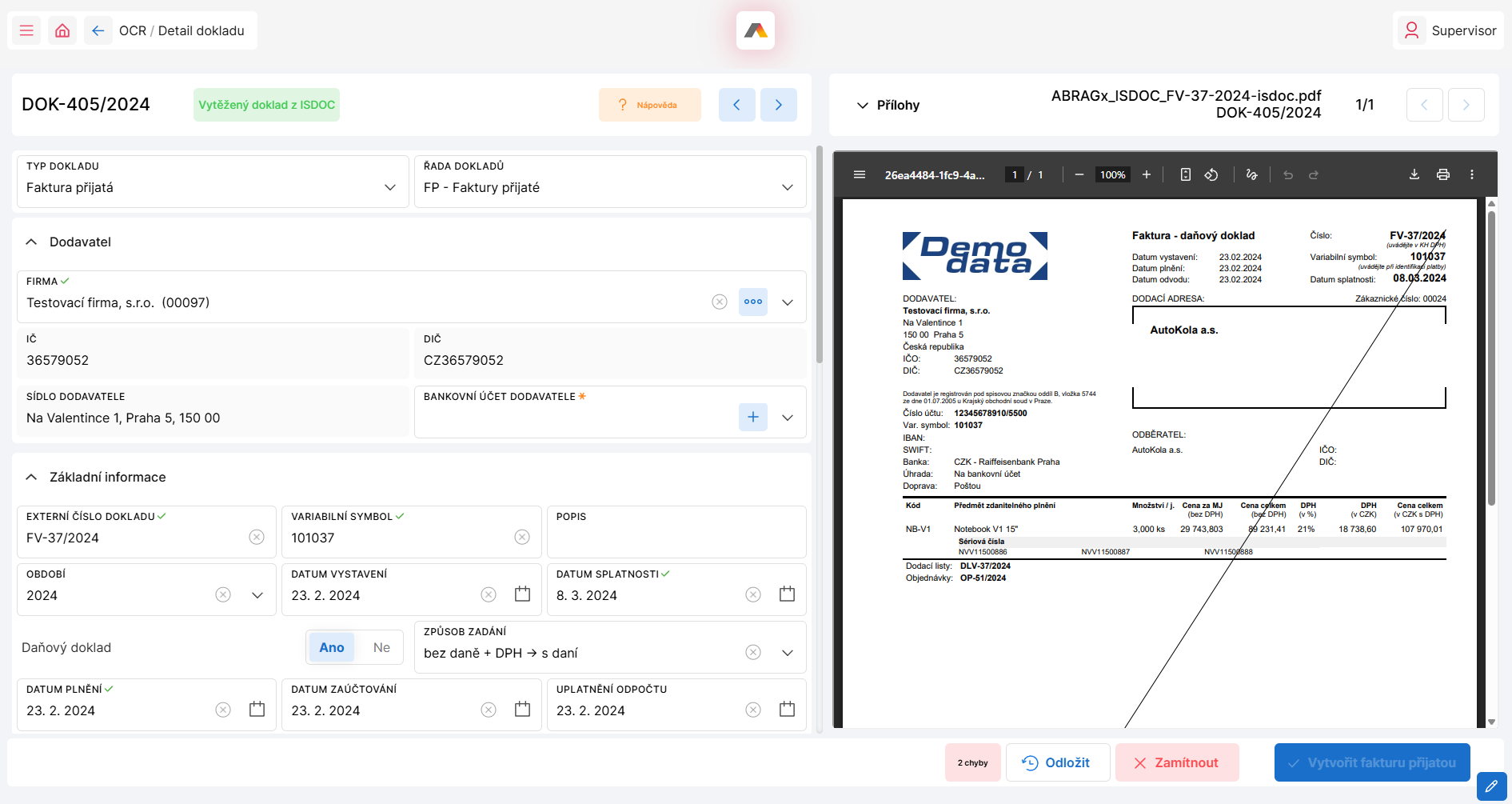 Aplikace OCR umožňuje automatické zpracování dokladů Faktur přijatých do systému ABRA Gen. Doklady se do seznamu načítají přes přílohy přijatých e-mailů, buď automaticky nebo je možné je nahrávat i ručně.