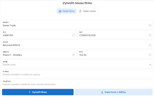 Při založení nové firmy je možné importovat údaje z ARES nebo je doplnit ručně. Je také možné přepnout se na záložku Zadat osobu a zde vytvořit nový záznam.