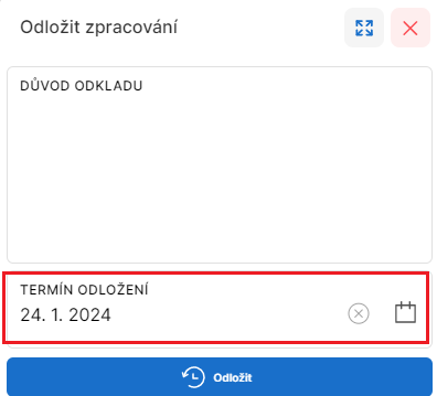 Odložit - funkce odloží zpracování na termín, který uživatel zvolí. Po stisku tlačítka Odložit se zobrazí dialogové okno, kde uživatel vyplní důvod odložení a datum, do kdy má být zpracování odloženo. Následně na základě nastaveného filtru nad seznam je tento doklad buď skrytý nebo zobrazen jako odložený. Po vyplnění důvodu a vybrání datumu odkladu a následném uložení se zobrazí další doklad k zaúčtování.