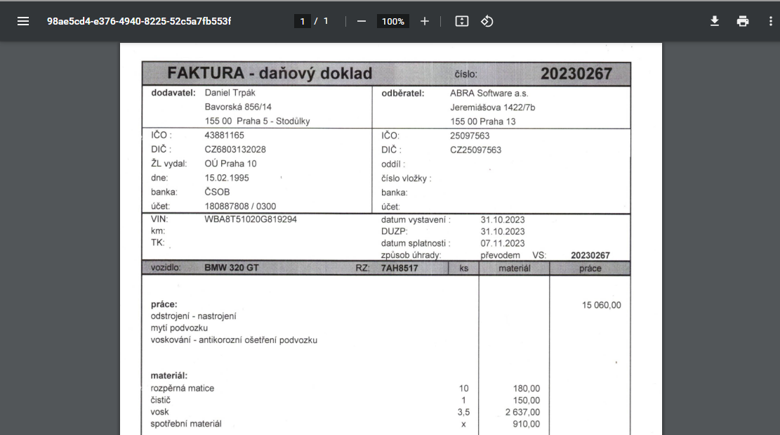 Náhled dokladu - S náhledem dokladu je možné pracovat pomocí ikon v náhledu. K dispozici jsou funkce jako zoom, tisk, stažení dokladu a další.