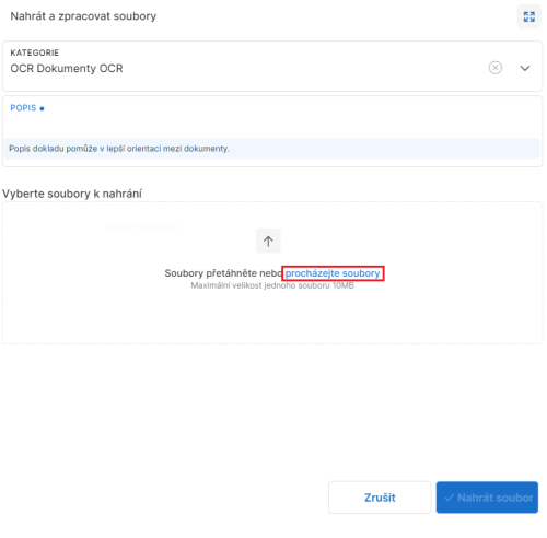 Tlačítko umožňuje nahrát doklady k vytěžení z následujících typů souborů: PDF, JPG, ISDOC, ISDOCX a dalších. Kompletní seznam formátů lze vidět, když uživatel stiskne volbu "Procházejte soubory"
