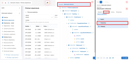 Pro vyvolání parametrů konkrétní aplikace otevřeme editační režim (modrá ikona s bílou tužkou vpravo dole), v obsahu vybereme celou aplikaci (první řádek) a Pod záložkou Akce a nastavení klikneme na tlačítko Parametry.