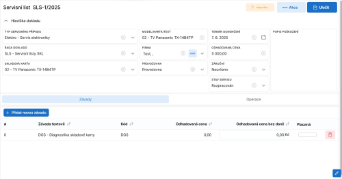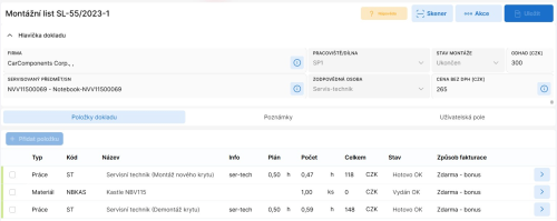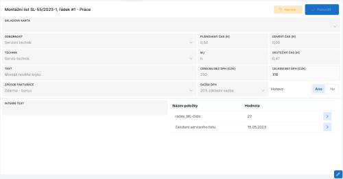 Obrazovka Servisní listy - detail slouží ke zobrazení detailu vybraného servisního listu a pro další práci s daným servisním listem.