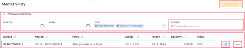 V dolní části obrazovky se poté nachází seznam montážních listů dle nastaveného filtrování. Každý stav montážního listu má svou určenou barvu, kterou se záznam zvýrazní. Přes ikonu tužky na řádku montážního listu se lze prokliknout na obrazovku Montážní listy - detail. Přes ikonu