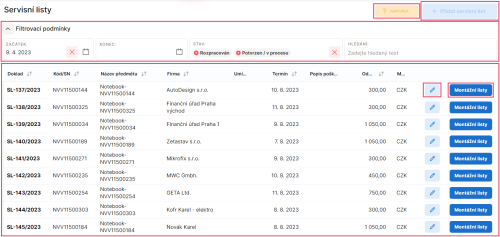 Obrazovka Servisní listy slouží ke zobrazení existujících servisních listů a také pro přidání servisního listu nového.